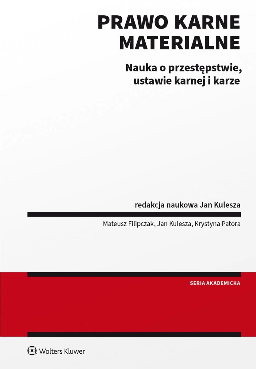 Prawo karne materialne : nauka o przestępstwie, ustawie karnej i karze / redakcja naukowa Jan Kulesza ; autorzy Mateusz Filipczak, Jan Kulesza, Krystyna Patora. - Stan prawny na 1 marca 2023 r. z uwzględnieniem zmian do Kodeksu karnego, które wejdą w życie 1.10.2023 r. i 14.03.2024 r. - Warszawa : Wolters Kluwer, 2023. - 596 stron ; 24 cm.